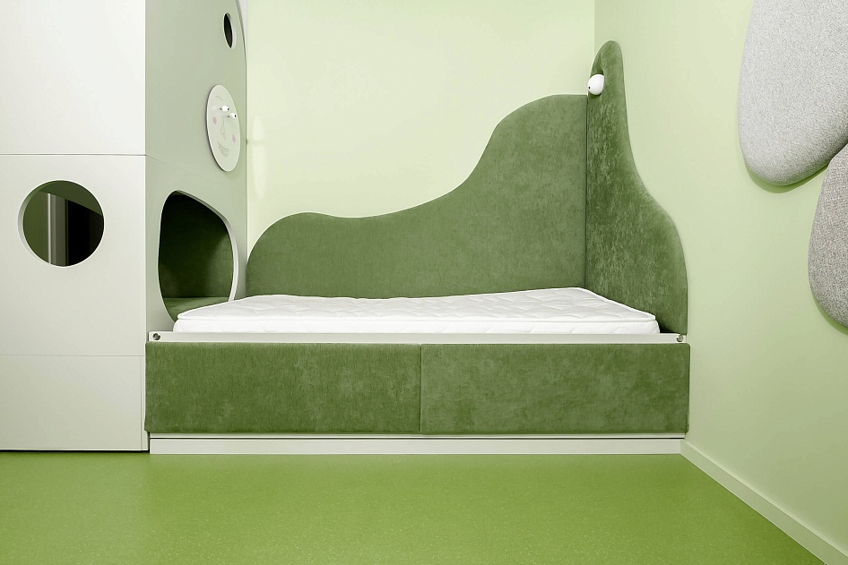 Основным цветом в комнате стали природные оттенки, приближенные к лесной тематике.
