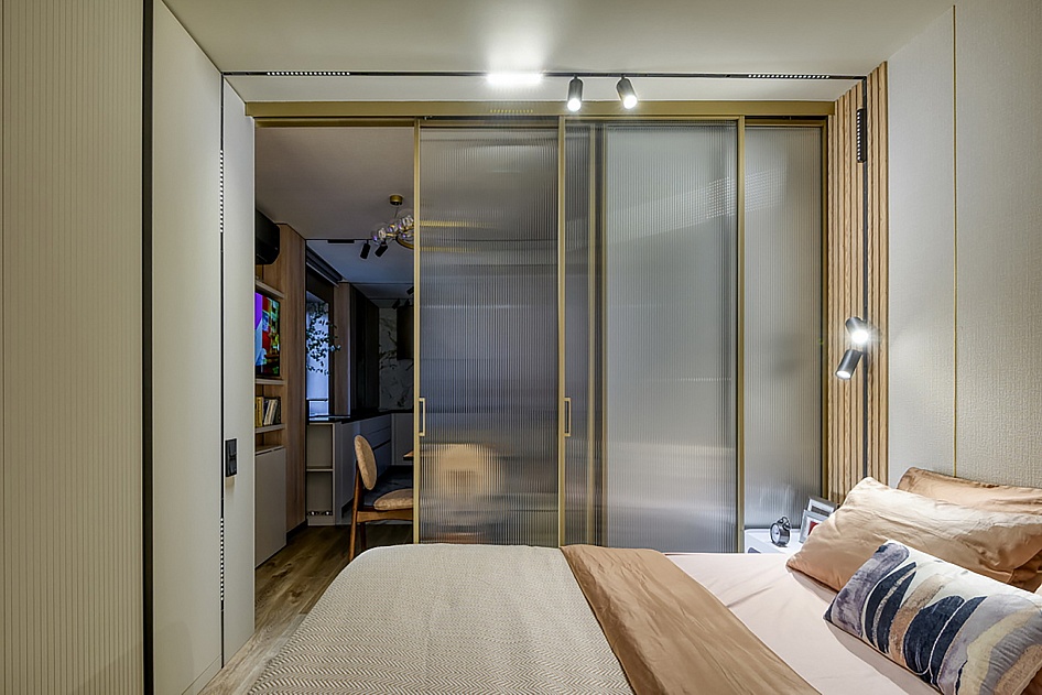 Спальню отделили раздвижной алюминиевой перегородкой от зоны кухни-гостиной.