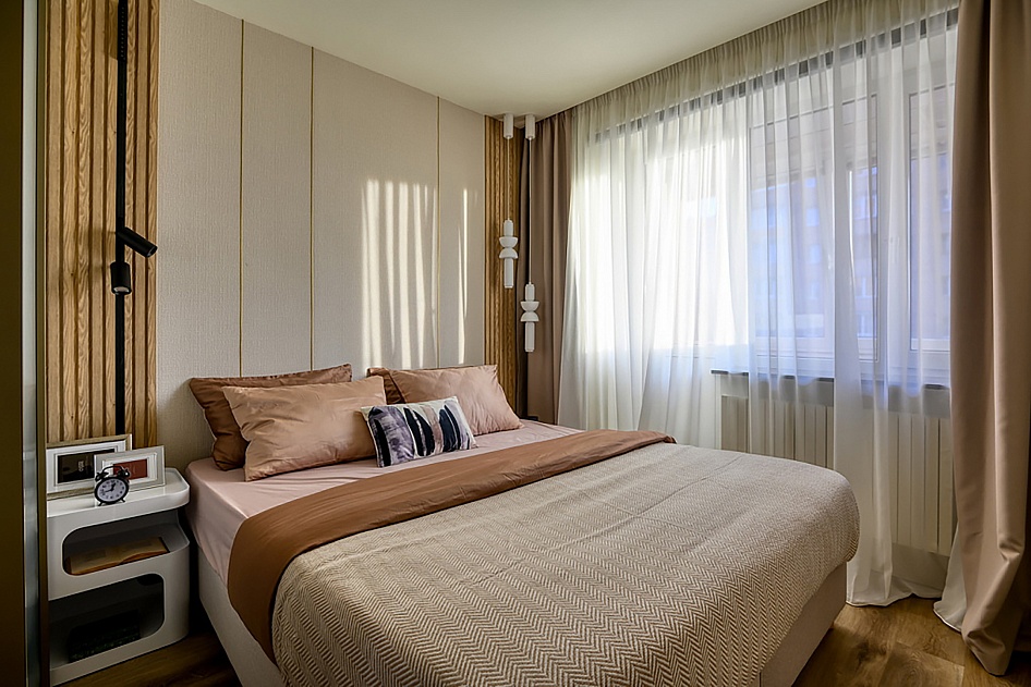 Вместо стандартной кровати в данный проект были поставлены основания Tatami, которые гармонично вписались в интерьер и образовали двухспальную кровать.