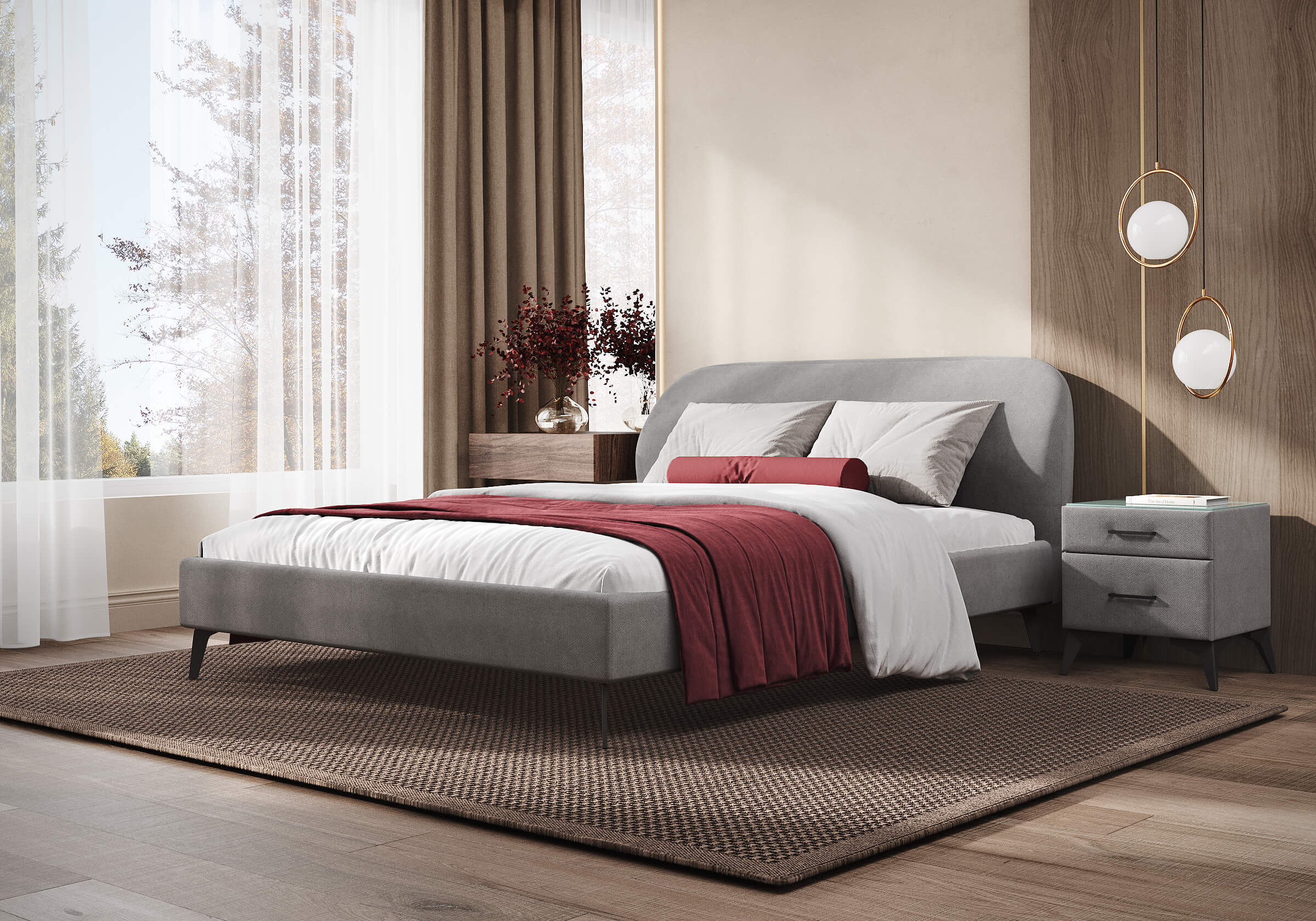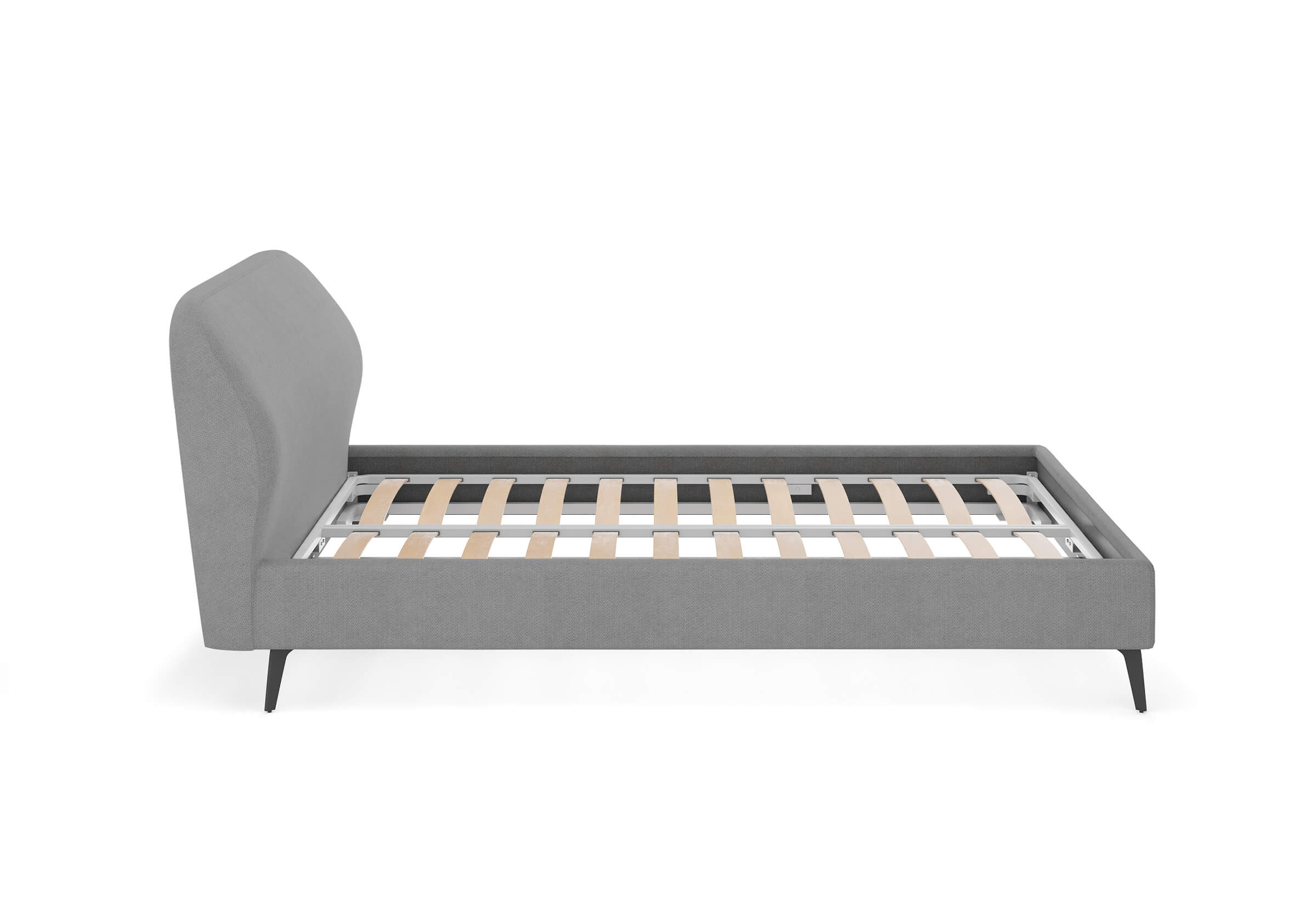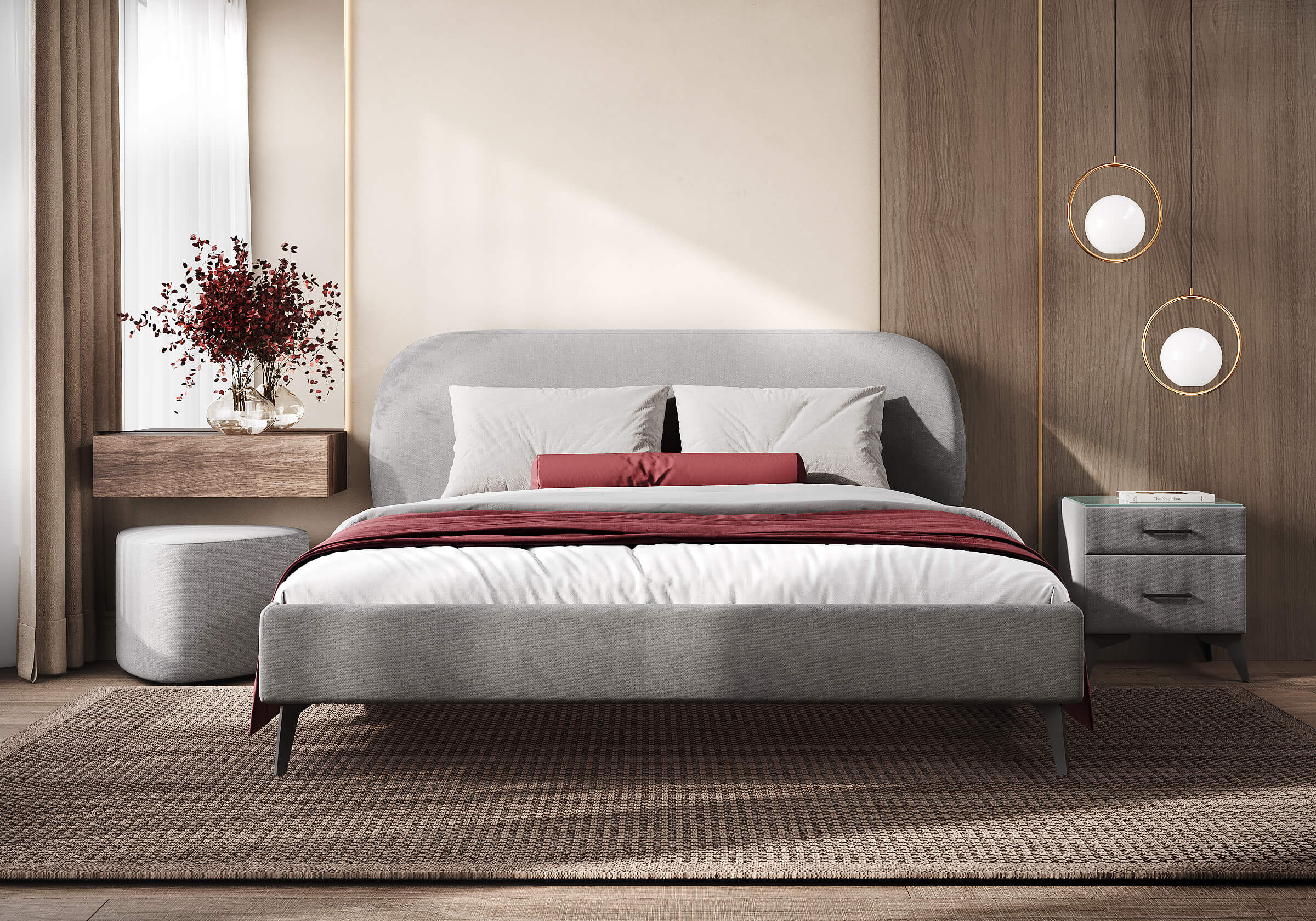 Кровать Katrin сочетает в себе модные тенденции – выглядит легко и лаконично. Мягкая форма изголовья с черными и тонкими опорами выглядят выразительно и подойдут любому современному интерьеру.  Задняя часть спинки в ткани, благодаря этому кровать можно установить в центре комнаты. Увеличенная прочность кровати достигается за счет металлического каркаса по периметру. Модель укомплектована ортопедическим основанием с ламелями. Благодаря высокому просвету не возникнет проблем с уборкой, в том числе проходимостью робота – пылесоса. Исполнение доступно во всех видах ткани.