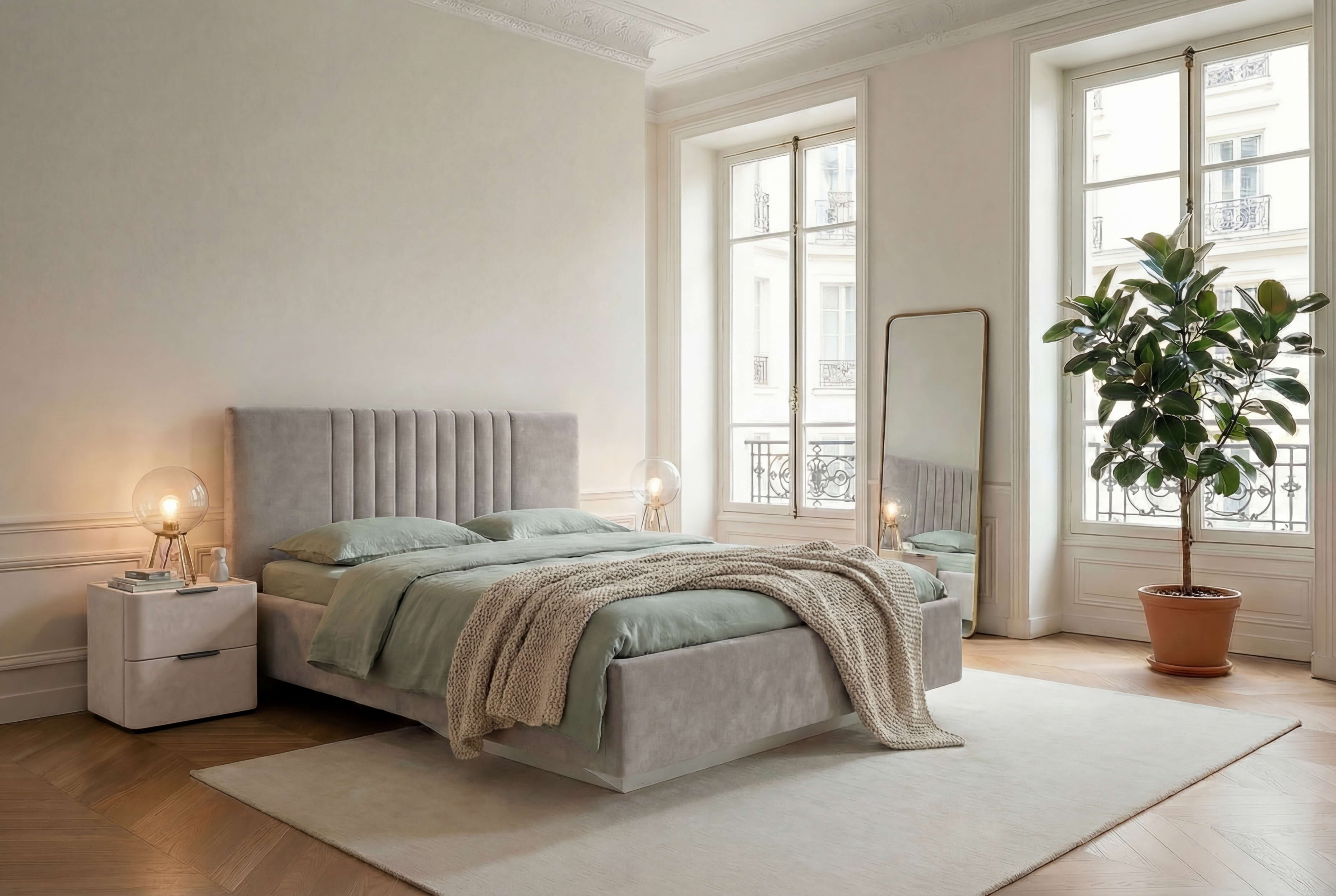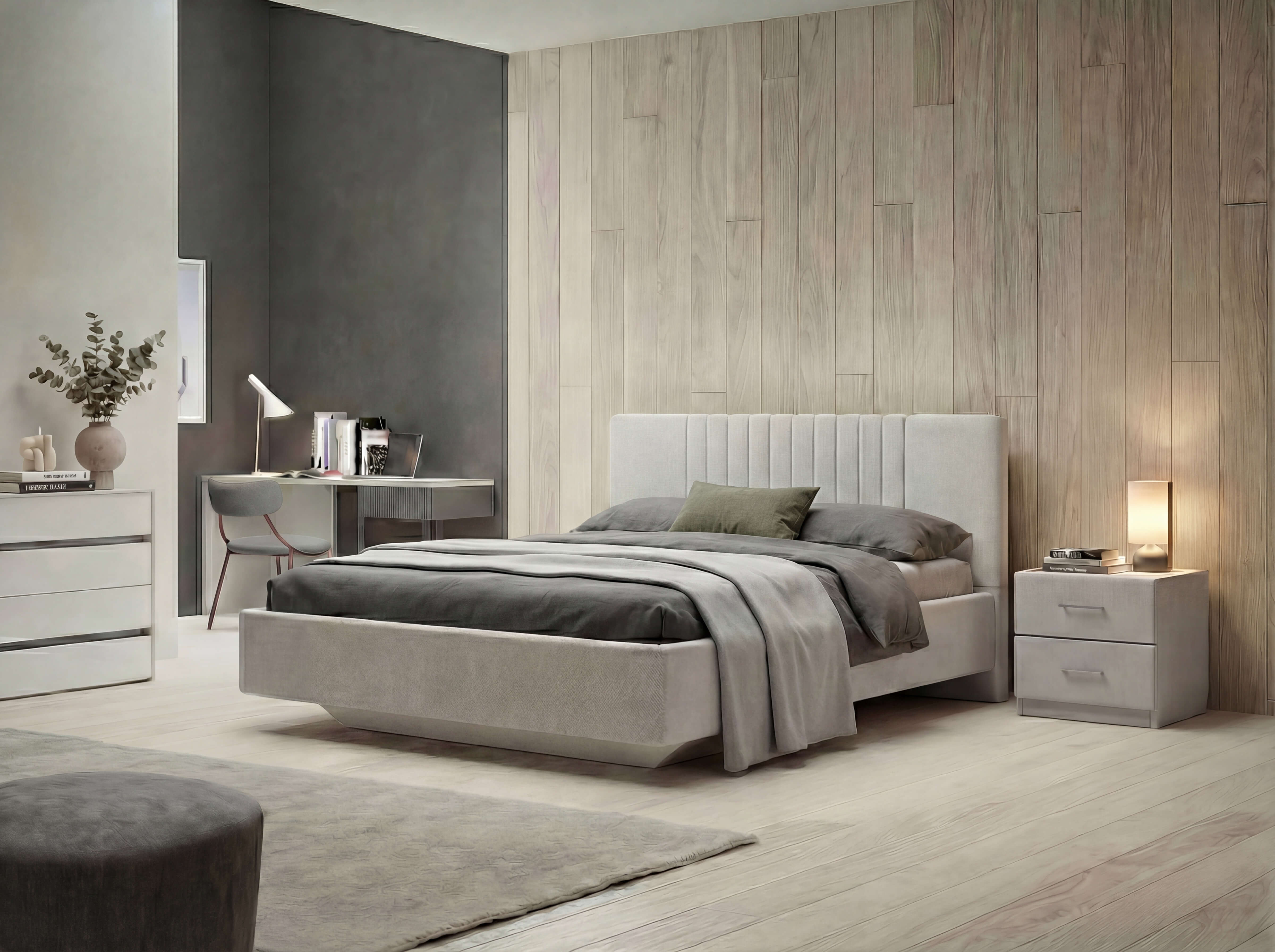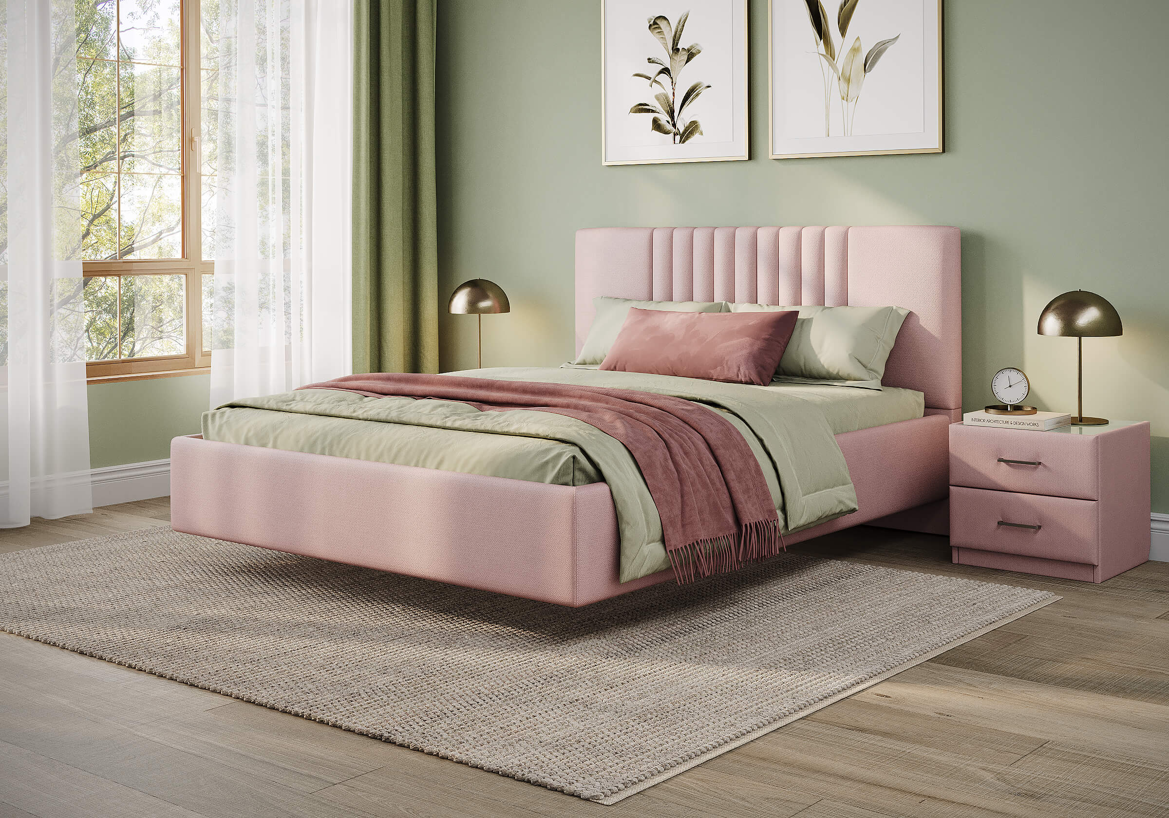 Благодаря уникальному конструктиву кровать будто парит над полом и придаёт интерьеру спальни оригинальность.
