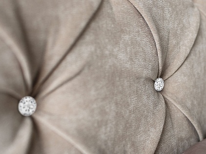 Элегантная интерьерная кровать с изголовьем, украшенным декоративными пуговицами и глубокой пиковкой. Модель изготовлена из ДСП. При необходимости кровать может быть укомплектована разборным или неразборным металлическим основанием с ламелями, подъемным механизмом с бельевым ящиком, трансформируемым основанием Aquarius.