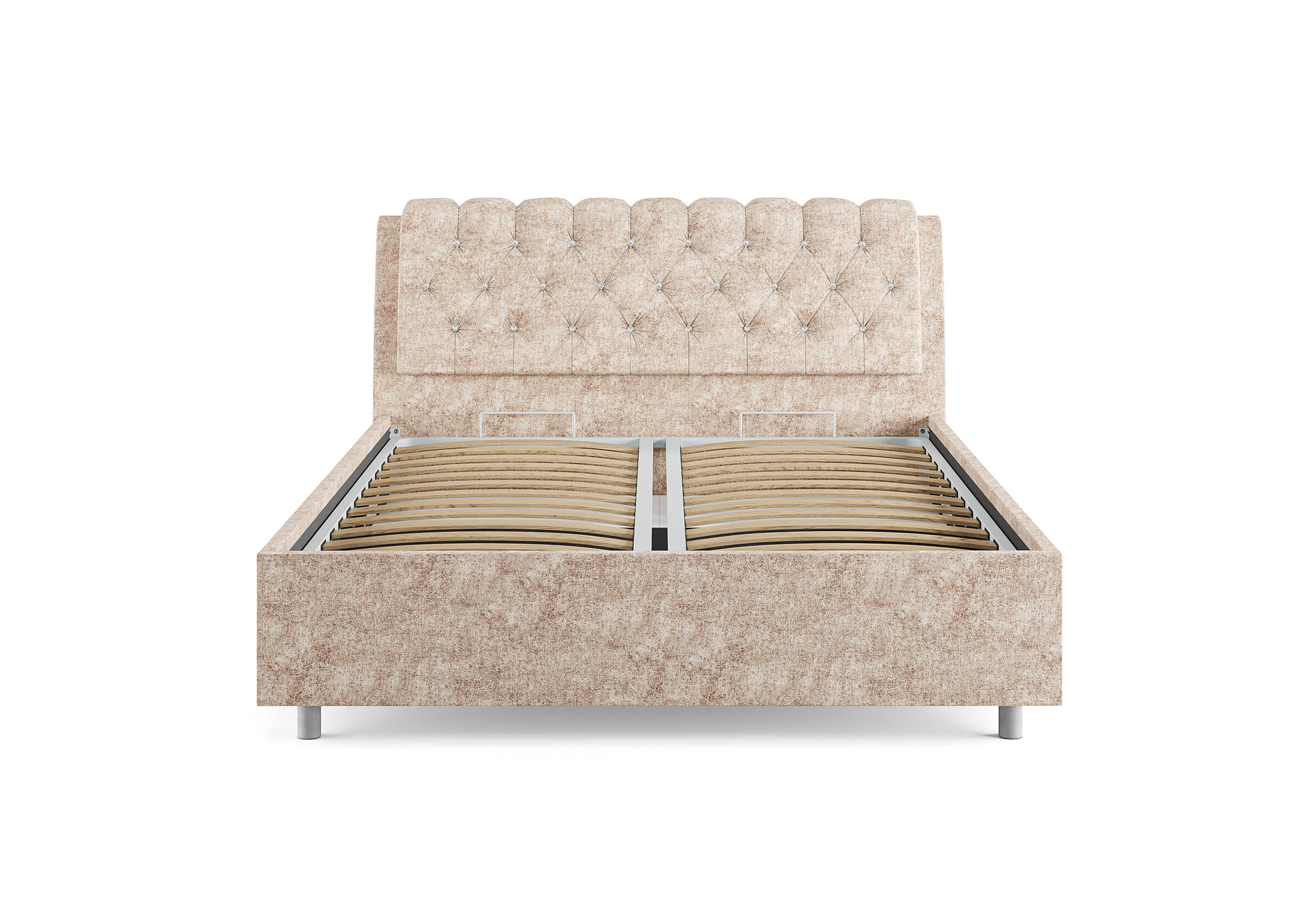 Элегантная интерьерная кровать с изголовьем, украшенным декоративными пуговицами и глубокой пиковкой. Модель изготовлена из ДСП. При необходимости кровать может быть укомплектована разборным или неразборным металлическим основанием с ламелями, подъемным механизмом с бельевым ящиком, трансформируемым основанием Aquarius.